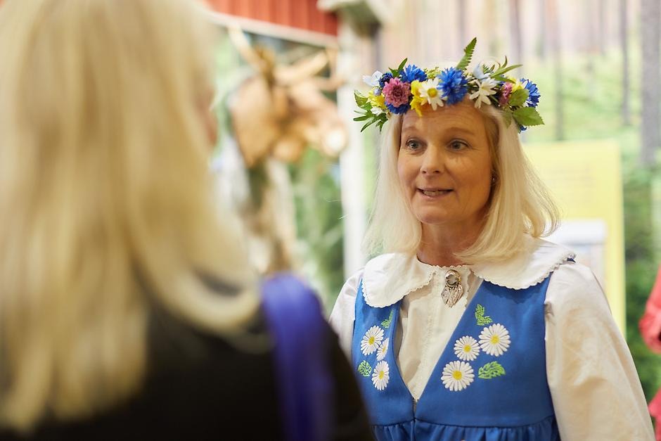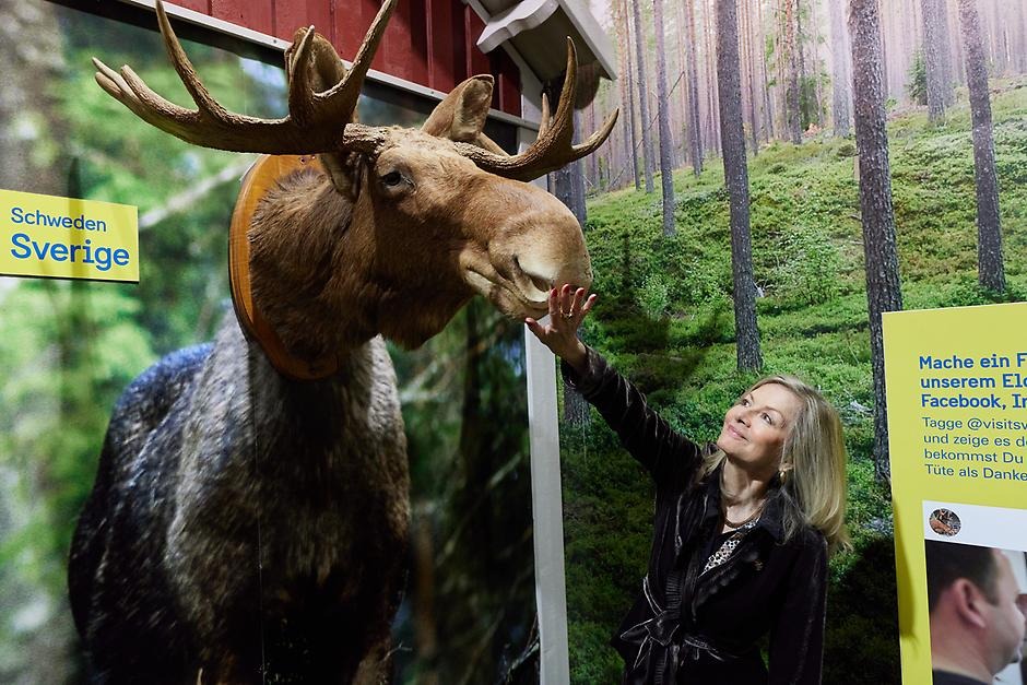 Älgen symboliserar Sverige och tyskar gillar det som är svenskt. Sveriges ambassadör i Tyskland, Veronika Wand-Danielsson, passade på att fotograferas med älgen i montern på Grüne Woche 2024. Många mässbesökare gör likadant under de tio mässdagarna. Foto: Jordbruksverket/Bernhard Ludewig